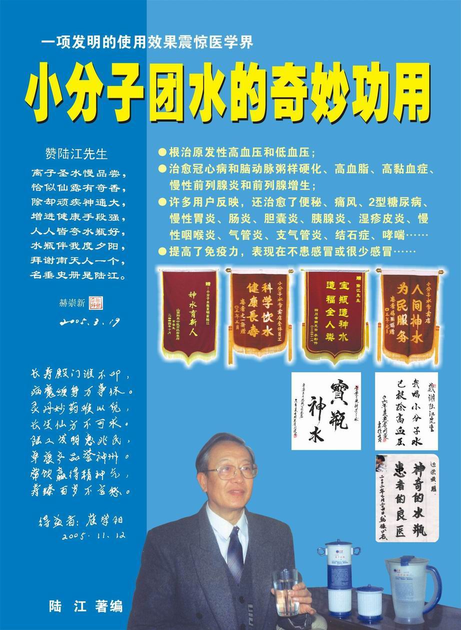人類幾千年來患以上病癥需終生服藥,幾十年也不能治愈。可是我國南寧的高級工程師陸 江,于1990年想根治高血壓,研究發(fā)明了離子水瓶,處理出微小分子團水供飲用,經過醫院臨床試用和專家鑒定,1999年獲中國發(fā)明專利權,產品于2000年投放市場后一直跟蹤調查,據全國各地用戶反饋:祛除了高低血壓、糖尿病和冠心病,并使前列腺增生、咽喉炎、鼻竇炎、慢性氣管炎、支氣管炎、矽肺病、哮喘、慢性胃炎、腸炎、慢性膽囊炎、慢性腎炎、腎衰、膀胱炎、便秘、痔瘡、風濕性關節(jié)炎和濕疹皮炎及中風后遺癥等病癥不藥而愈。為什么喝微小水能治20多種病?陸 江從1991年德國科學家發(fā)現細胞膜水通道僅為2納米獲得啟發(fā),認為多種器官患病是因細胞脫水,不能正常代謝和分裂增殖,才使器官細胞減少致衰弱萎縮而形成細胞缺水性病癥。22年來的實踐有力地支持了“細胞脫水致病”這一重要論點,表明喝微小水可滿足細胞的生理需求,補水就能祛病,是生命科學新亮點。